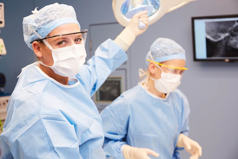 De kaakchirurg bekijkt het resultaat van de operatie en beoordeelt de voortgang van het herstelproces.